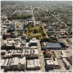 Aerial view looking west to Latimer Square