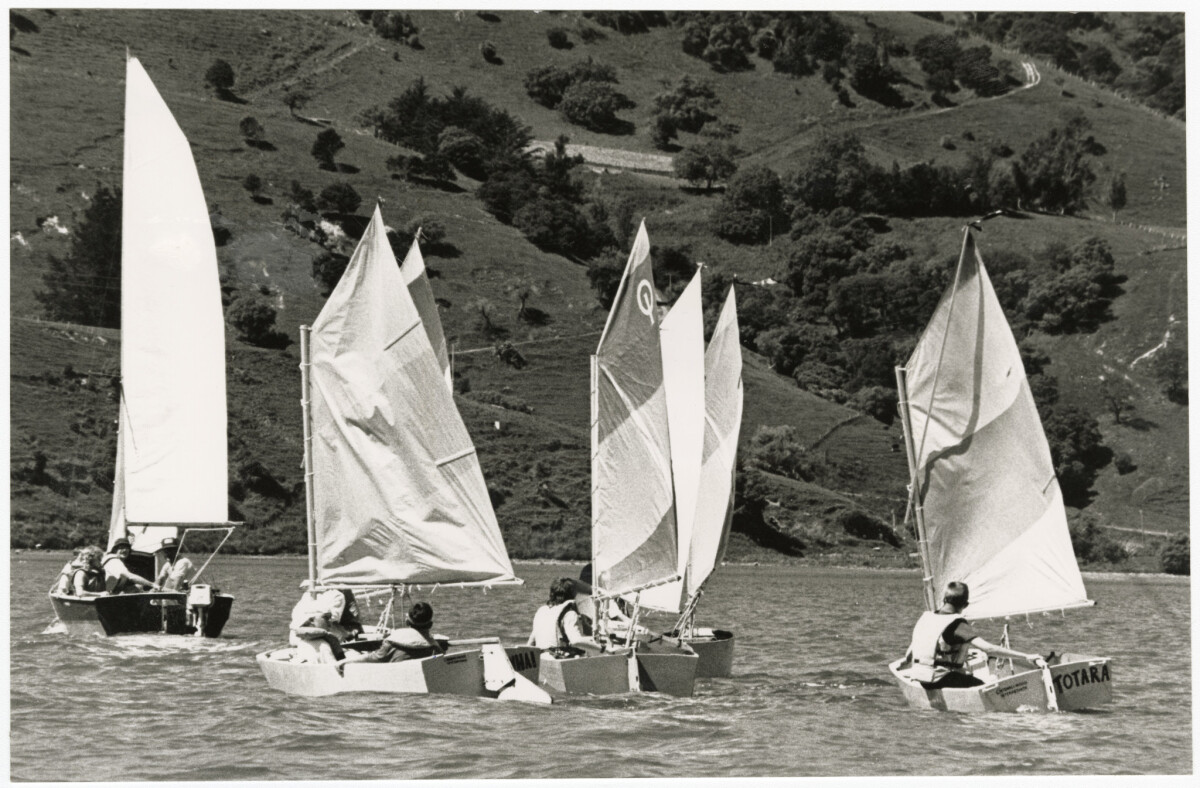 View across Takamatua Bay on the Banks Peninsula of Chisnallwood Intermediate School students operating an Optirmist sailboat as part of a four day camp.
