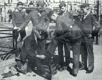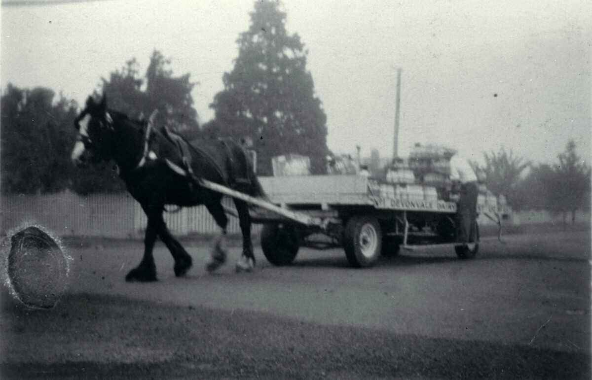In 1942 petrol rationing came into force and milk was delivered by horse float with two women staffing each float. The milk was delivered right to the door. This photograph shows a Devondale Dairy Company milk float. The company was owned and operated by Ben Johns and Ernie Forbes from their dairy on the corner of Johns and Main North Roads. Children used to enjoy a ride by hanging on to the side of the float. A house just visible behind the float belonged to a brother of a former Prime Minister of New Zealand, George Forbes