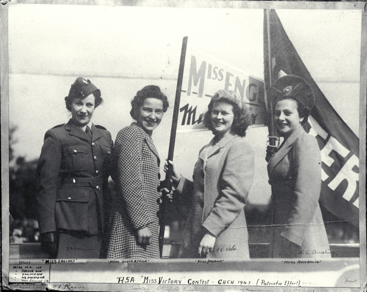 Four candidates in the contest held at the King Edward Barracks as part of the Returned and Services Association's United Nations Fair to raise funds for patriotic purposes. From left: Miss England, Miss South Africa, Miss Poland and Miss Australia.