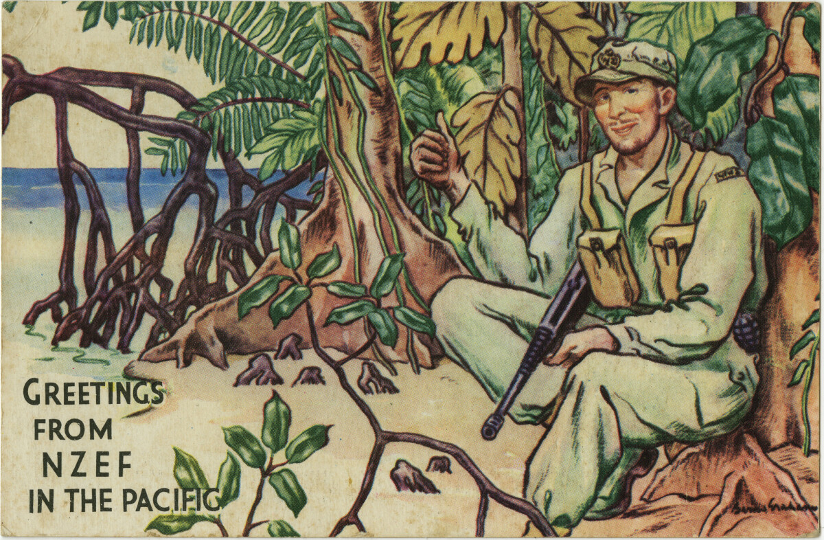 Illustration on this Christmas, New Year greeting postcard, 1943-1944, depicts a soldier of the New Zealand Expeditionary Force in jungle uniform worn in the Pacific area. The postcard was issued by the National Patriotic Fund Board.
