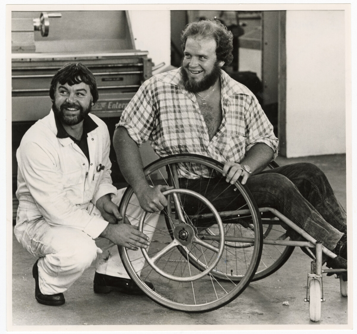 Graham Condon, paraplegic athlete, in his racing wheelchair with the chair's builder Graham Hamblin (left) of Healing Industries Ltd. The chair is being checked over ahead of the "Star" City to Surf race in Christchurch.