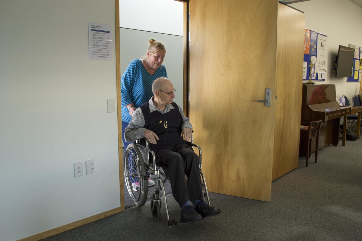 A member of the Senior Citizens Society arriving in a wheelchair at the Christchurch North Methodist Parish, 68 Harewood Road, Papanui.