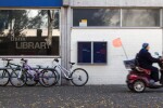 View of a woman on a mobility scooter zooming past the camera outside the former Bishopdale Library. Several bicycles are parked outside the building at Bishopdale Village Mall, Bishopdale.