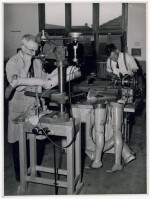Workmen in a workshop making artifical limbs.