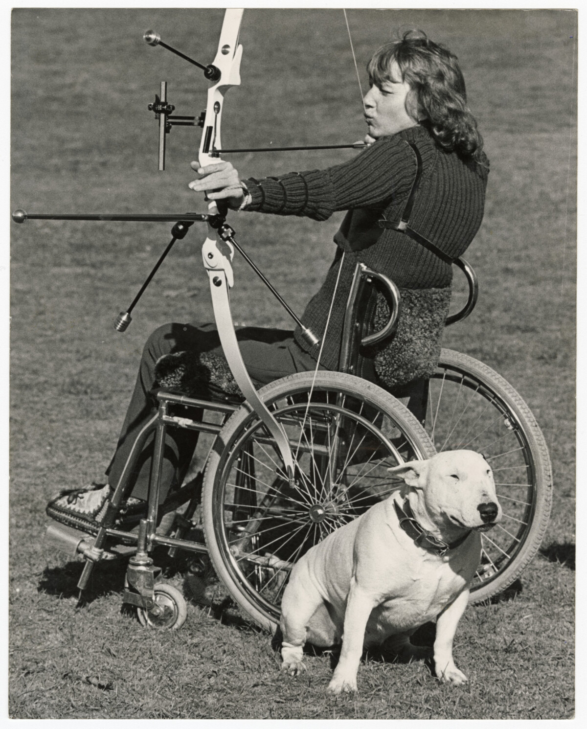 Archer, Neroli Fairhall, practicing archery skills at Burwood Park ahead of the Paraplegic games in Australia. Next to her wheelchair is her pet bull terrier, Wappa.