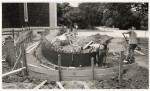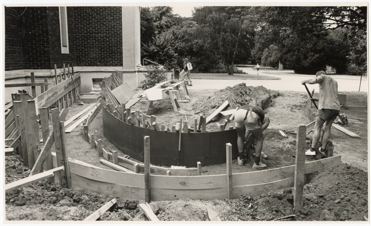 View of construction workers building a disability ramp to improve accessibility to the Robert McDougall Art Gallery from the Botanic Gardens.