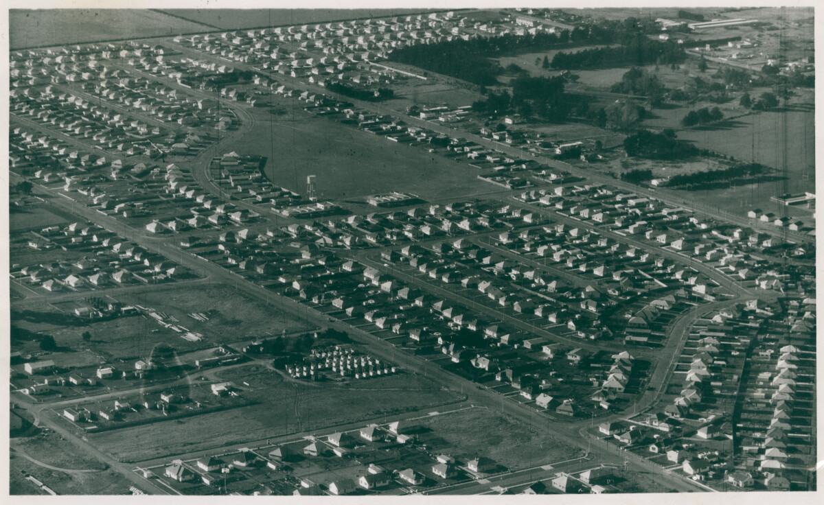 Aerial view of new housing area at Hornby. A shopping area, with the water tower just behind is in the centre, on the edge of the recreation reserve.