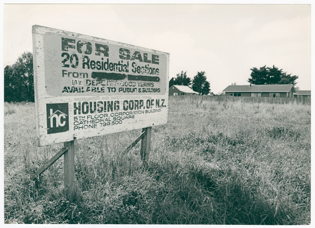 A Housing Corporation sign advertising residential sections for sale in the Redwood area of Christchurch.