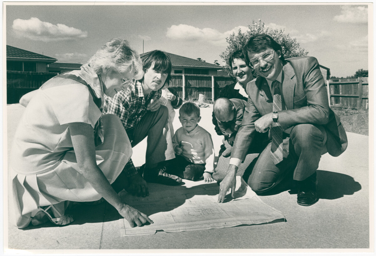 The Minister for Housing, Phil Goff with Mrs Margaret Austin, MP for Yaldhurst and the 6000th recipients of the Government's Home Start scheme, Lindsay Watts, Sara Watts and their children Aaron, Nichola and Catherine. The group are looking at plans for their new house on Pages Road, Aranui.