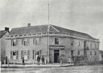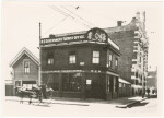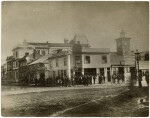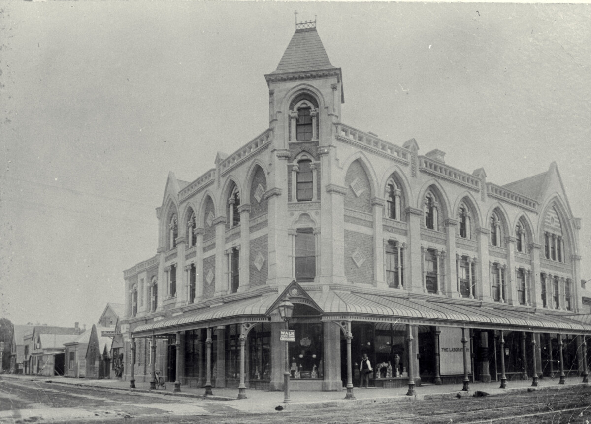 Exterior of the Golden Age Hotel on the corner of Hereford and Colombo streets. Henry Allen is standing in shirt sleeves at the front door.