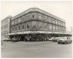 Exterior of Mason Struthers & Co. Ltd E. Reece Ltd store on the corner of Colombo Street and Litchfield Street during their closing down sale. Cars, pedestrians and cyclists are in the foreground at the main road intersection.