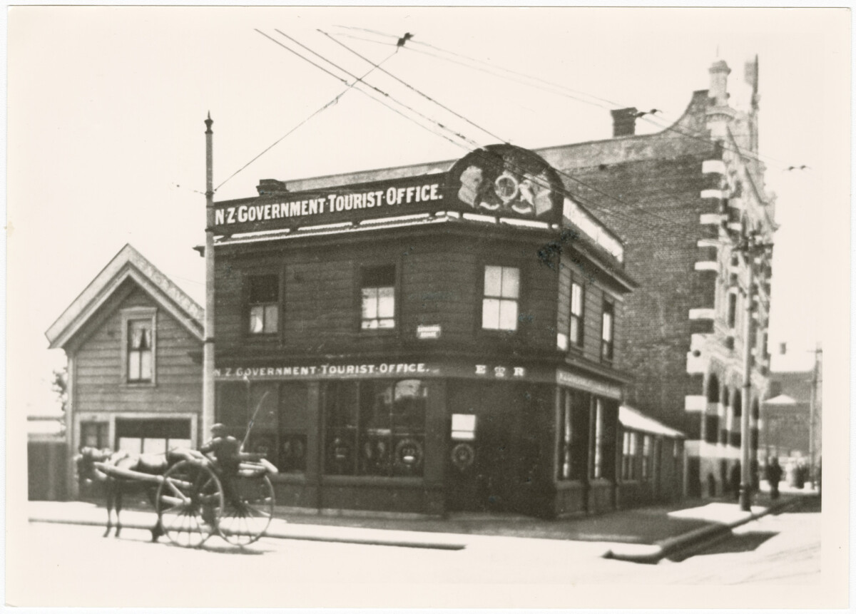 Exterior of the New Zealand Government Tourist Office building in Cathedral Square. A man on a sulky is sat outside the office.