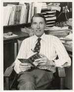 Portrait of Professor of Medicine, Don Beaven, of the Christchurch School of Medicine sat at his desk with a book on wine as part of his study into the wine drinking habits in New Zealand.