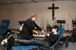 A woman donating blood at the mobile New Zealand Blood Service unit set up at 111-113 Seaview Road in the Grace Vineyard Beach Campus building in New Brighton. The woman is recording the event on her mobile phone.