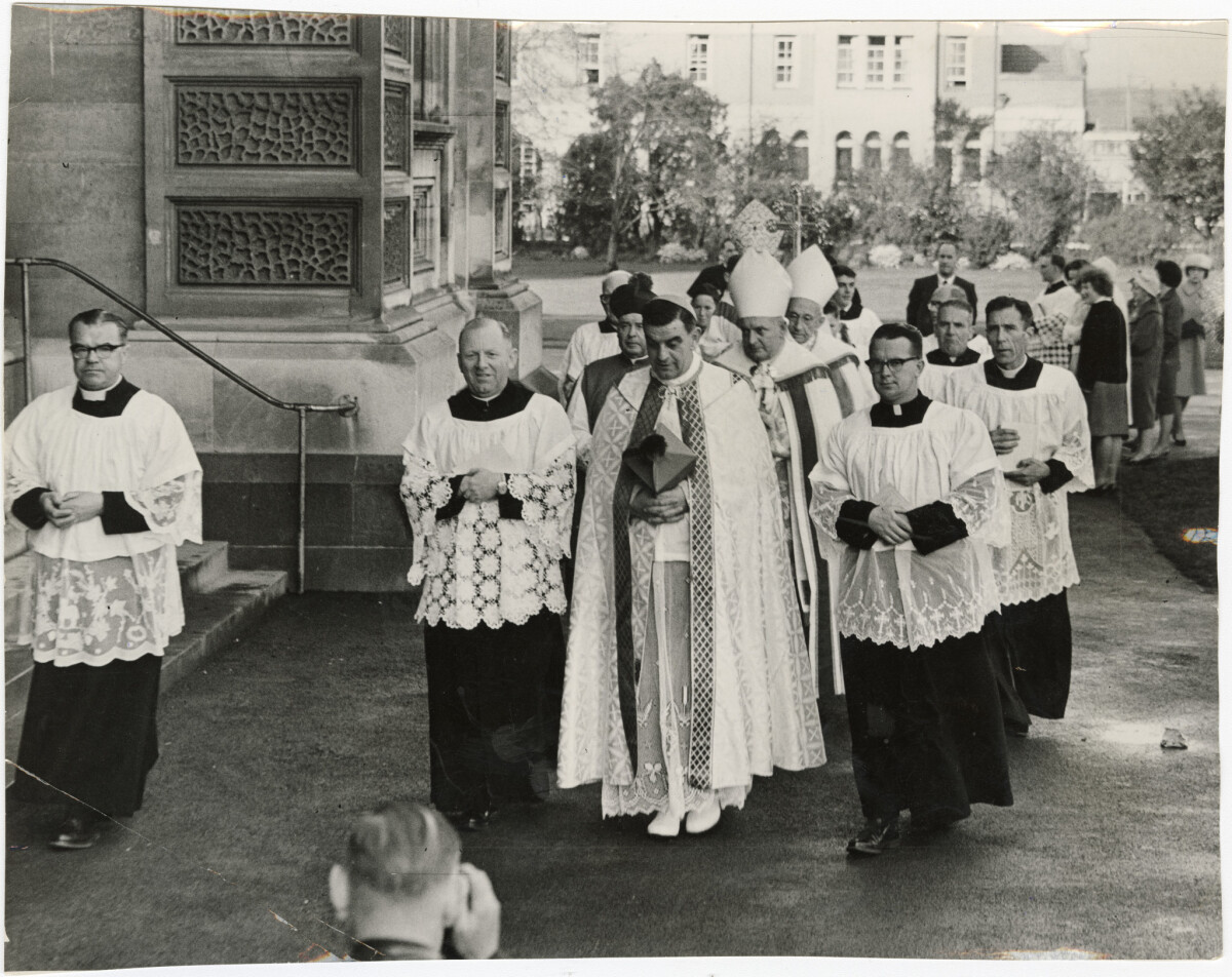 The Roman Catholic Bishop of Christchurch, the Most Rev Dr B. P. Ashby, accompanied in procession by other bishops and priests to the Cathedral of the Blessed Sacrament for his consecration.