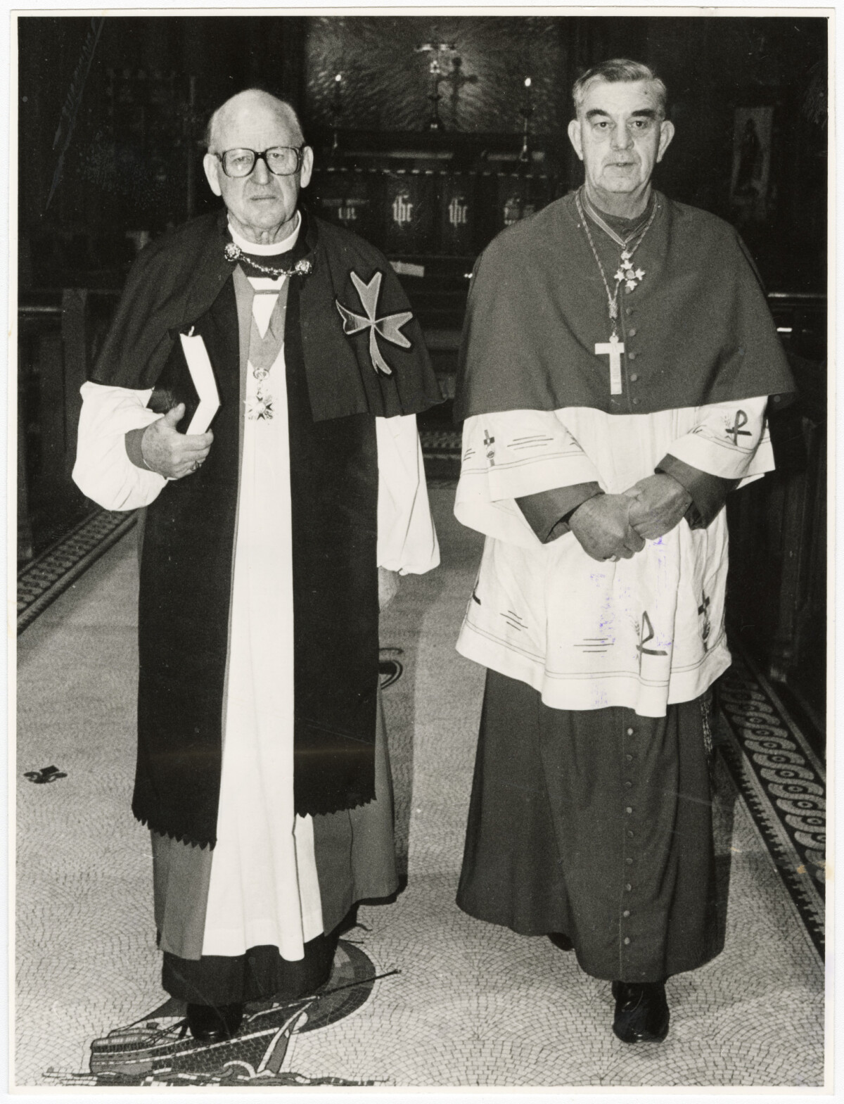 The former Catholic Bishop of Christchurch, the Most Rev Brian Ashby (right), with Bishop Wiggins, suffragan Bishop of Wellington at a service to mark the annual admissions and promotions of the non-denominational military and hospital Order of St Lazarus of Jerusalem at the Cathedral of the Blessed Sacrament.