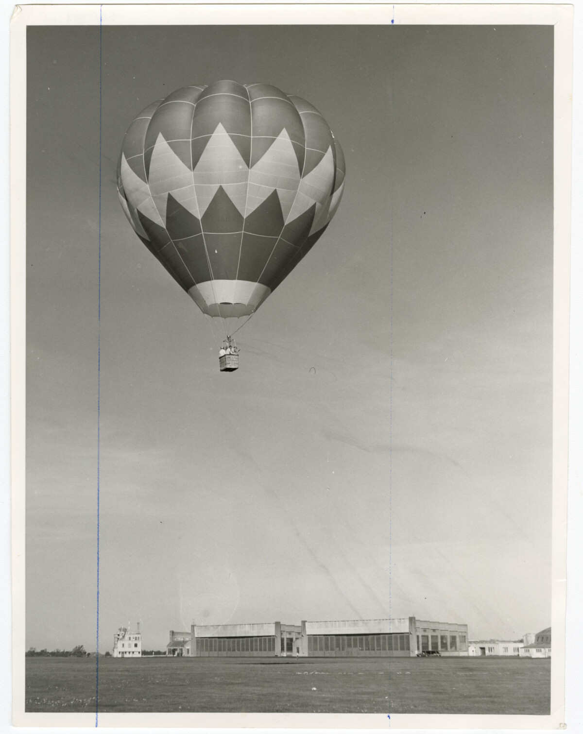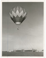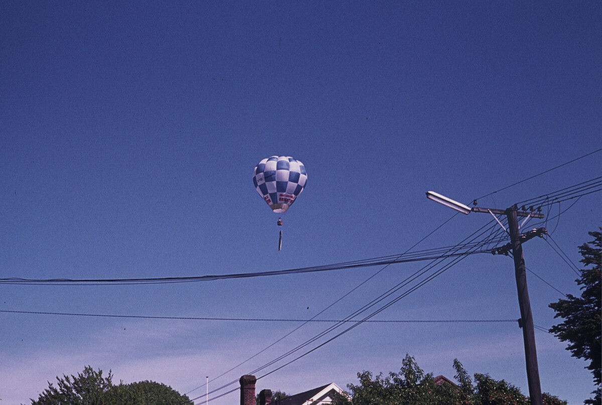 A hot air balloon captained by Flight Lieutenant "Roly" Parsons, an administrative officer at the RNZAF base at Wigram. The RNZAF base is visible below the balloon.