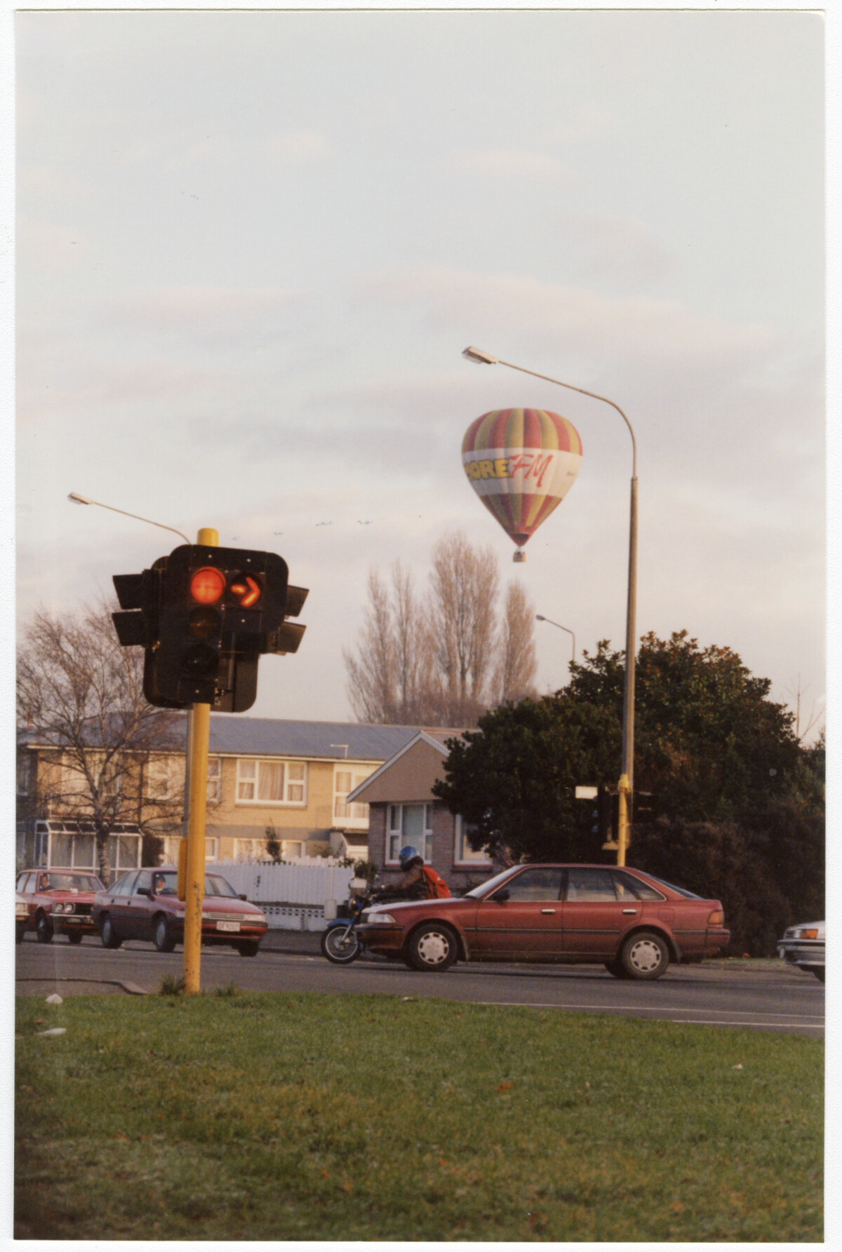 A More FM hot air balloon over houses, taken at an intersection in Somerfield.