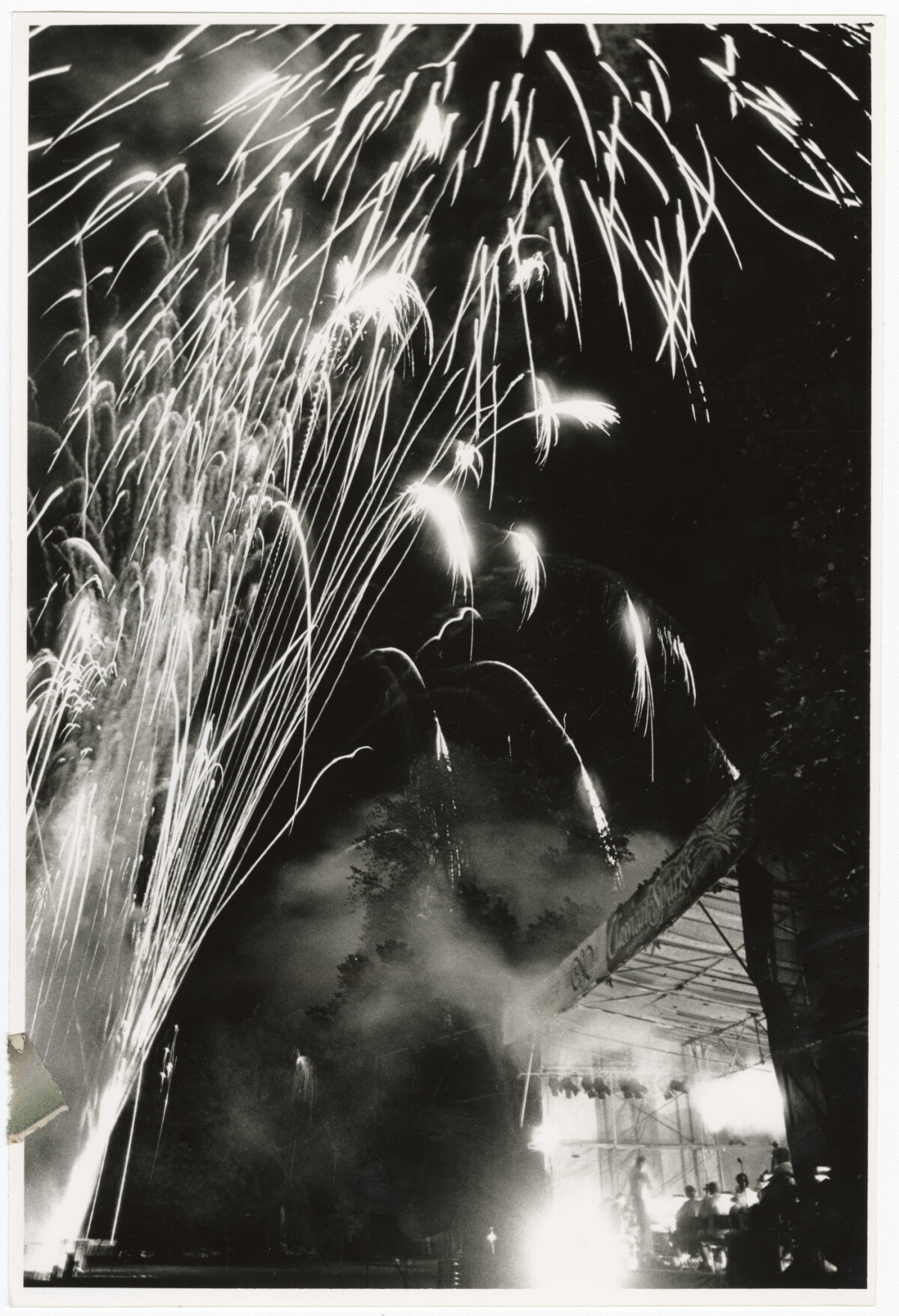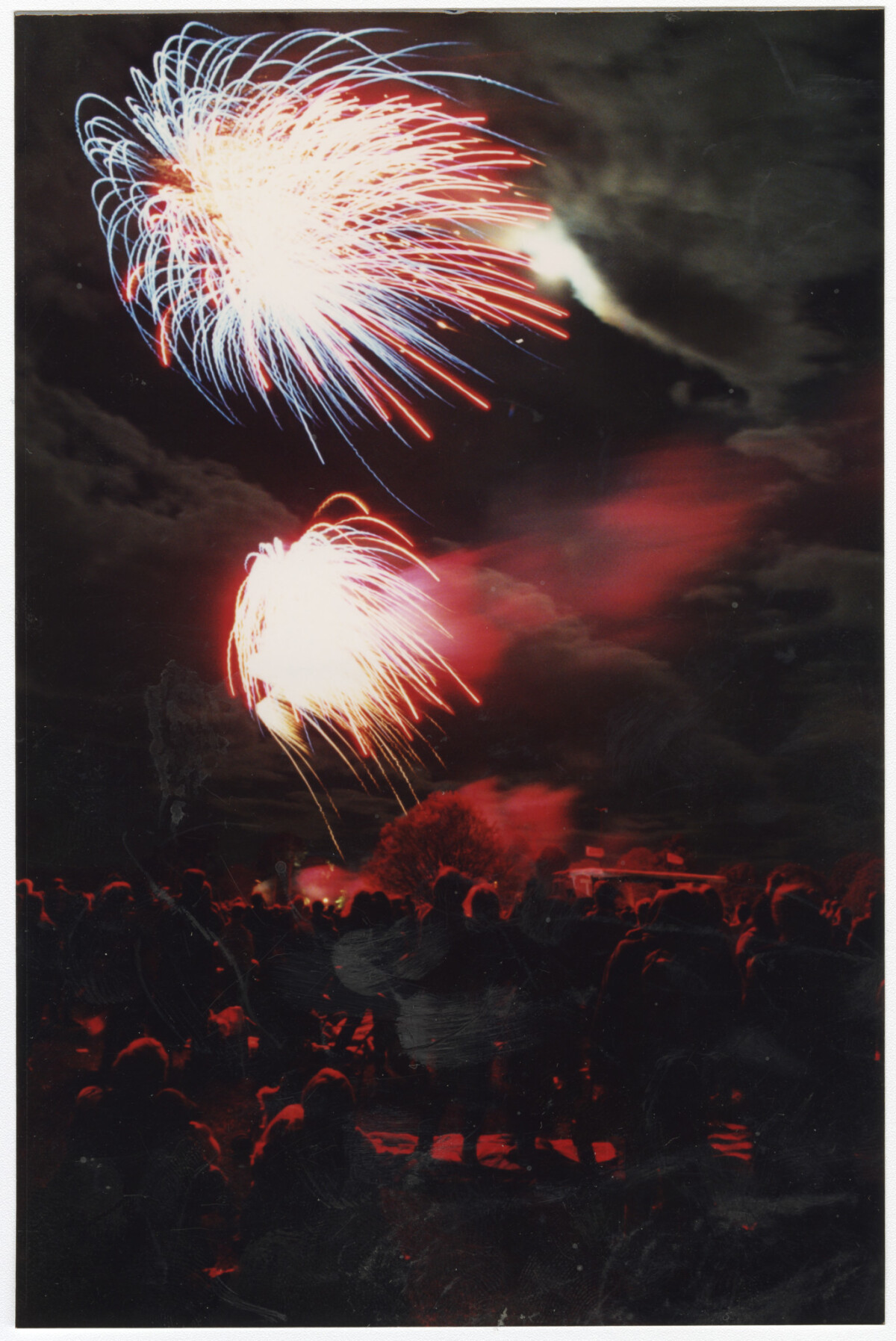 Fireworks with crowds in the foreground at the Sparks in the Park event in Hagley Park.
