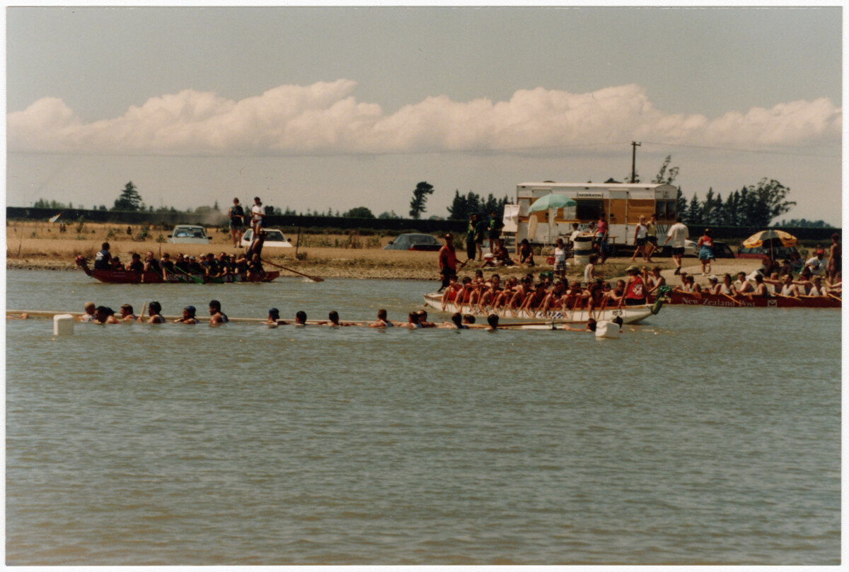 View of Dragon boat race teams preparing for a race as part of the festival. A food truck is parked on the banks on Lake Crichton.