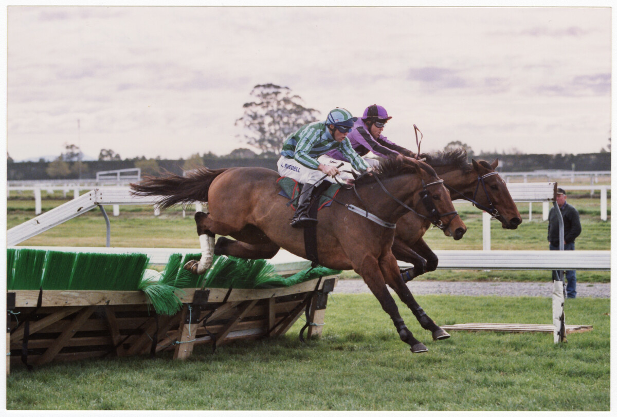 Jonathan Riddell on Magic Man race horse with Eddie Lamb on Garaina behind taking a jump during the PGG Homeby Steeplechase at Riccarton Park.