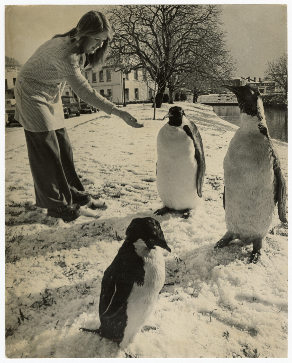 Kim Collier with taxidermied penguins on the Avon River bank in the snow.