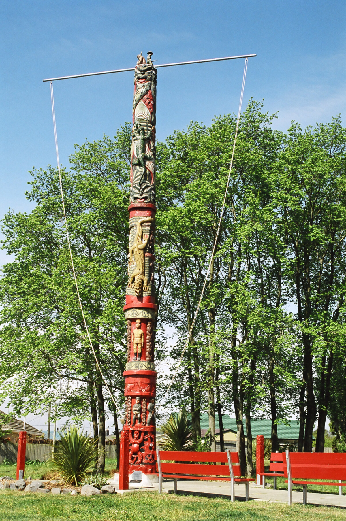 Carved lintel and stockade at the gateway entrance to Nga Hau e Wha National Marae.Ngā Hau e Whā means the the Four Winds. The name is symbolic of being a meeting place for all peoples from everywhere.