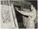 Miss Jenny Flaver putting colour on some souvenir head scarves using a new process of textile screen printing, the only one of its kind in New Zealand. The process uses Swiss dyes in place of a printing ink to leave a soft in texture pattern.