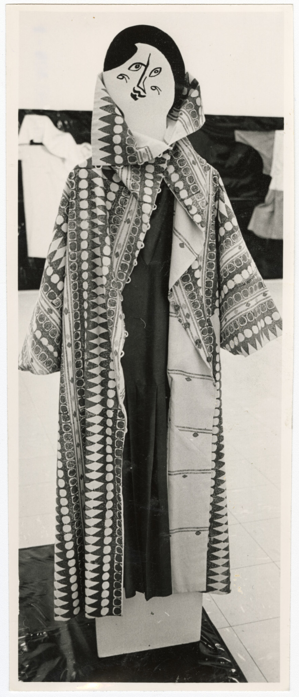A printed coat on a mannequin displayed at the Canterbury Society of Arts gallery as part of a larger exhibition by artists Fanny Buss and Kobi Bosshard.