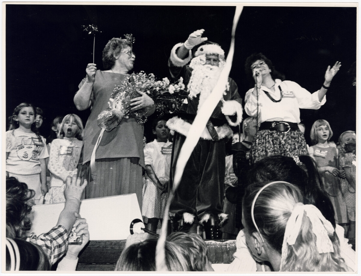 Father Christmas with Aunt Hilda and children on stage at Christchurch Town Hall at the Starlets Christmas party.