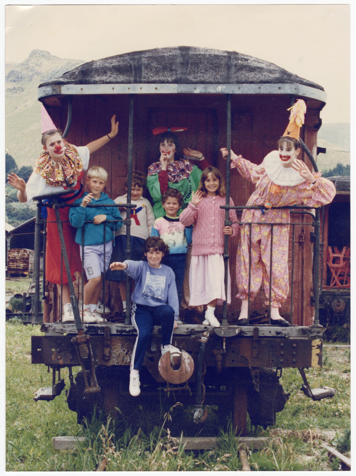 Starlets dressed as clowns posing on the back of a train carriage at Ferrymead with the Port Hills in the background.