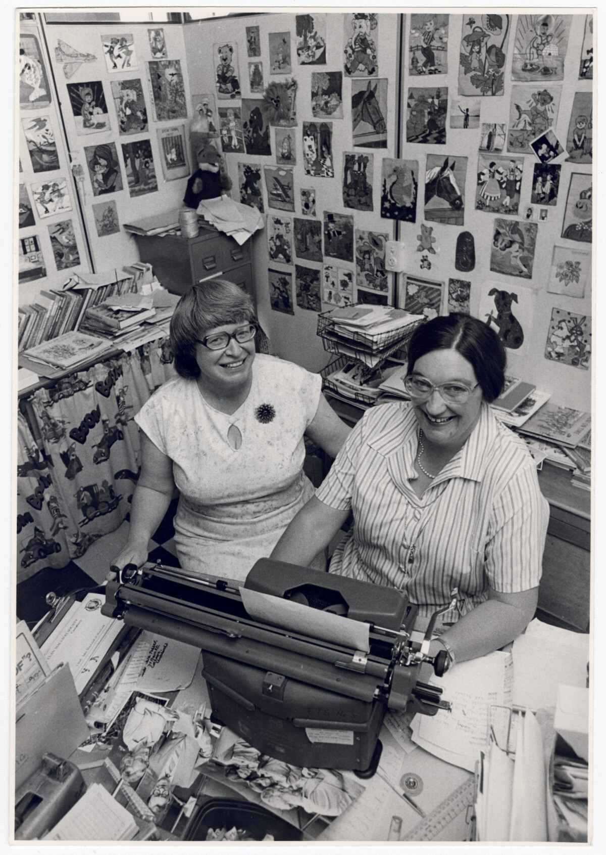 Cousin Thea (left) and Aunt Hilda at a typewriter preparing the Starlet pages for the The Star newspaper. In the background and drawings and paintings sent in by children across the Christchurch area.