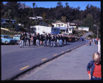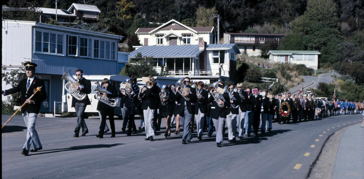 1975. Anzac parade on Beach Road, Akaroa. A well attended turnout for this event nearly 40 years ago. The Akaroa Silver Band leads the way followed close behind by members of the R S A, Sea Scouts, Cubs, Girl Guides and Brownies. As a matter of interest, of all the buildings in background, only one exists today.
