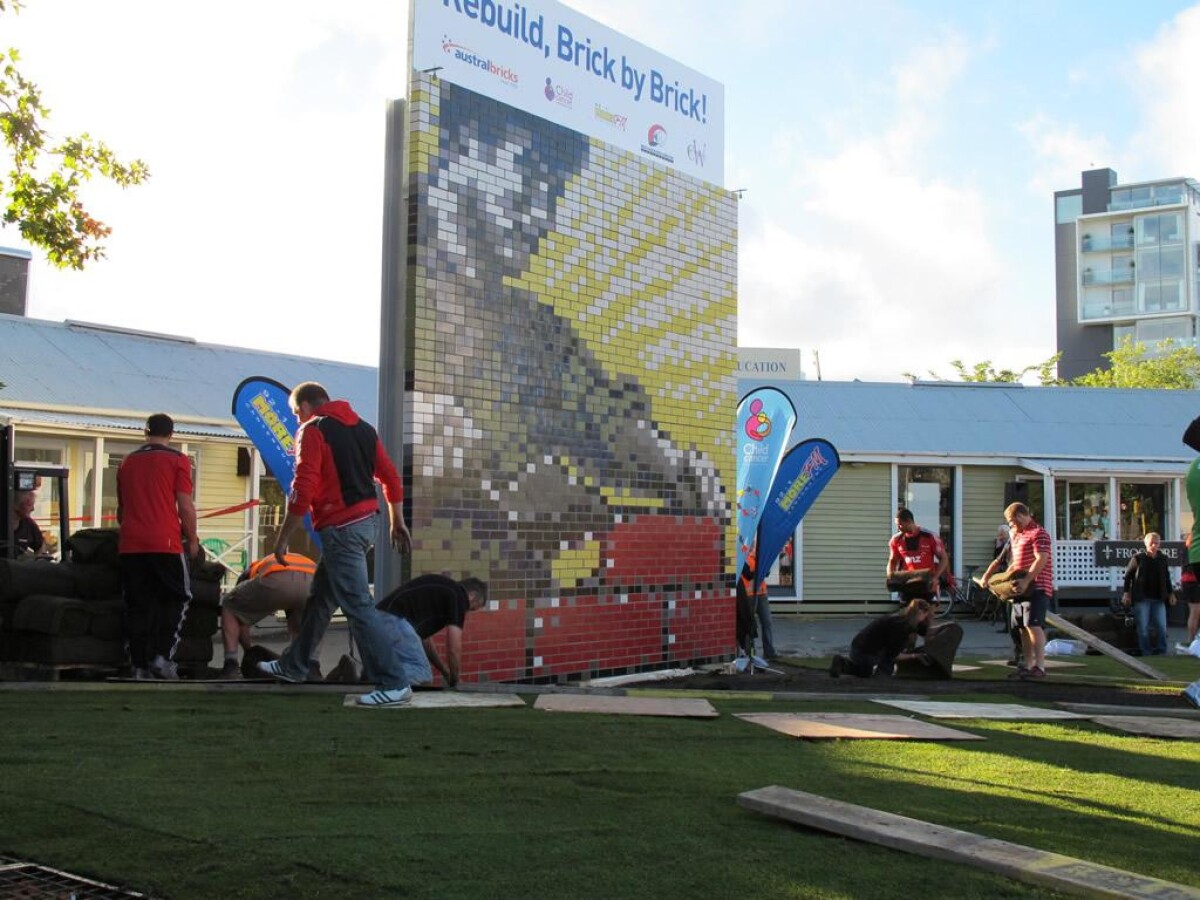 Brick art was unveiled at 8.15am on 8 February 2011 on the former Asko site, corner of Victoria and Salisbury Street, Christchurch. The Brick Art project was a Greening the Rubble Project.