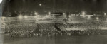 Panoramic image of floodlit crowds in the stands and on the pitch at Lancaster Park stadium during Billy Graham's Crusades, an evangelical campaign which toured around the world.