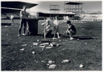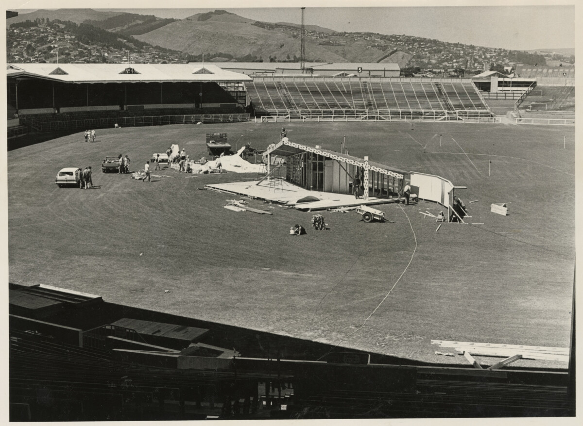 Workmen erecting a display in the main pitch at Lancaster park for a Jehovah's Witness assembly. The Port Hills are visible in the background.