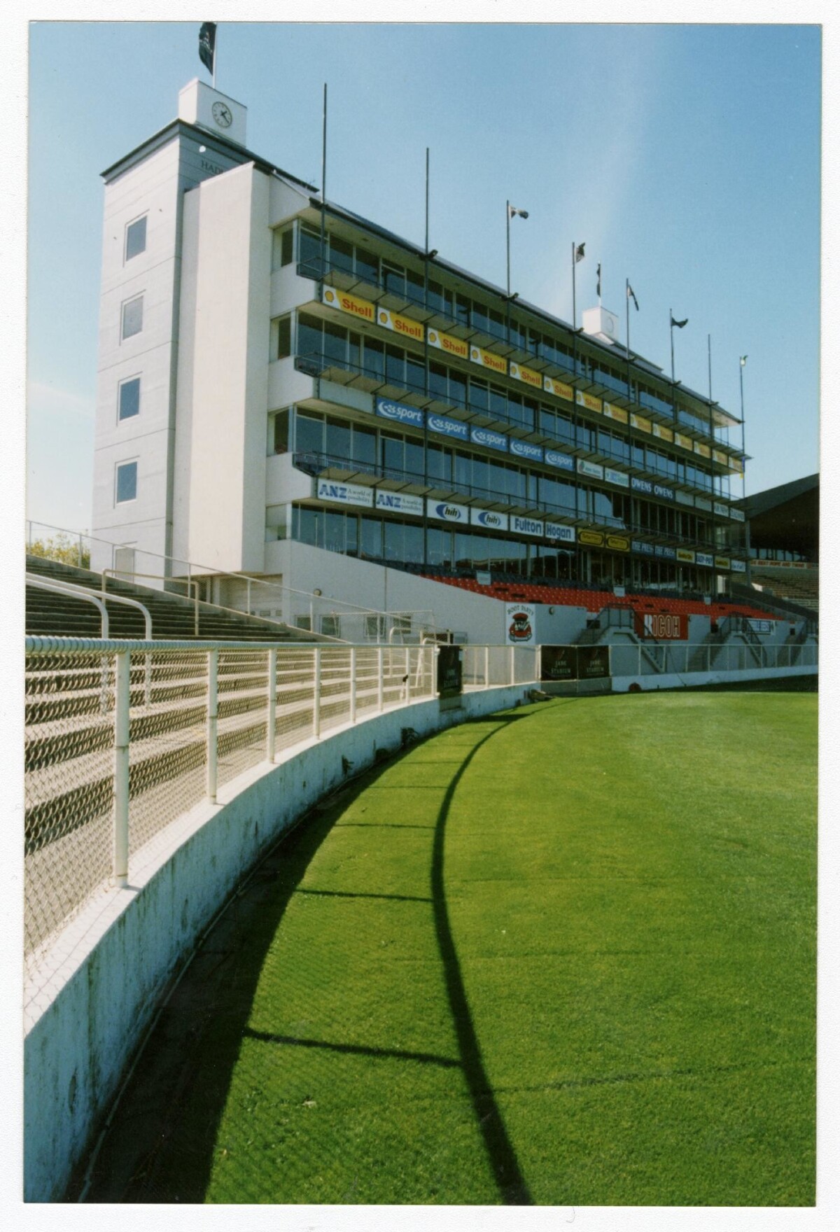 View across part of the pitch to the stands and the Hadlee stand with ANZ and Shell advertisements on the front at Lancaster Park stadium, Waltham.