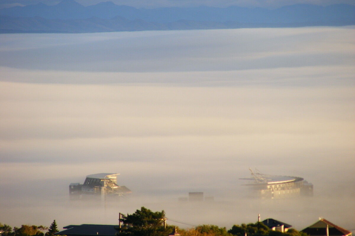 "Jade Stadium showing-up through Christchurch fog. Photo taken from my hill-top residence in Huntsbury." - Contributor's note