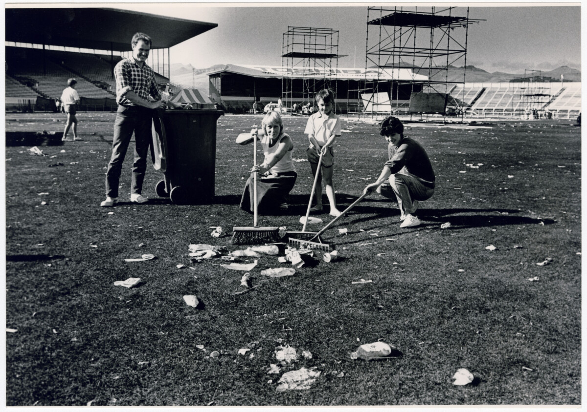 Members of Sydenham Rugby Football Club clean up at Lancaster Park following a Dire Straits concert the previous evening. Pictured are, from left, Brent Smith, Caroline Mehlhopt and her son Nathan and Christina Andrews