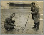 Mr C.H.J. Rhodes, chairman of the competitions committee, and Mr S.E. Husband inspecting the bare and muddy ground on the pitch at Lancaster Park.