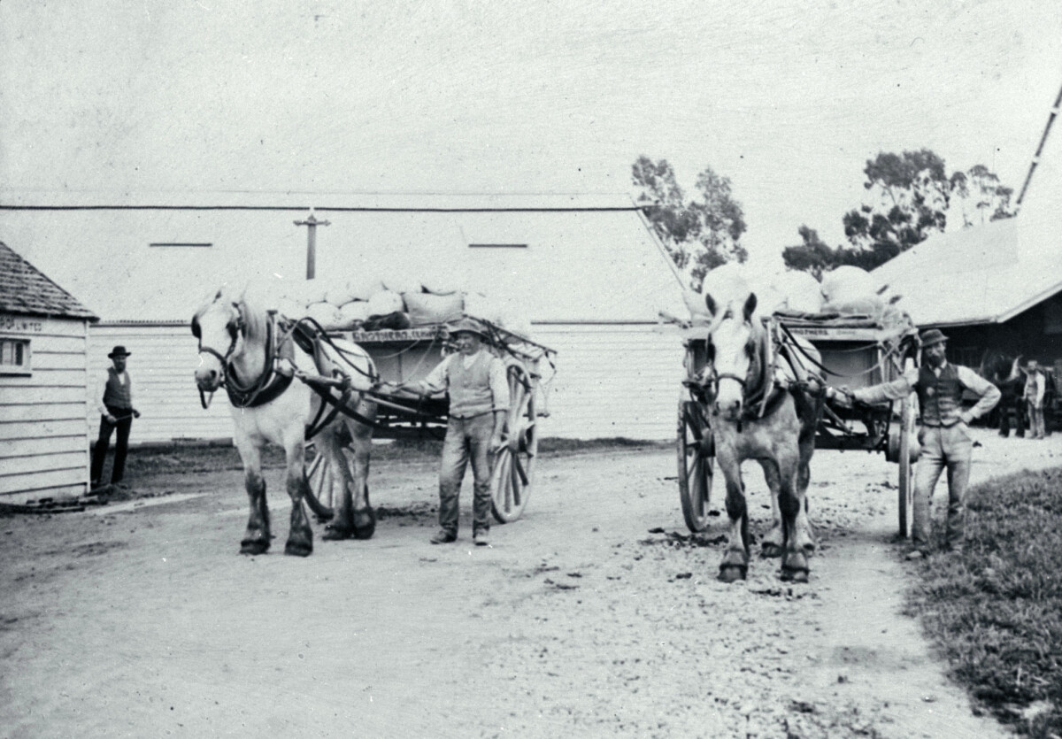 Two carts loaded with flour outside the Riccarton Mill