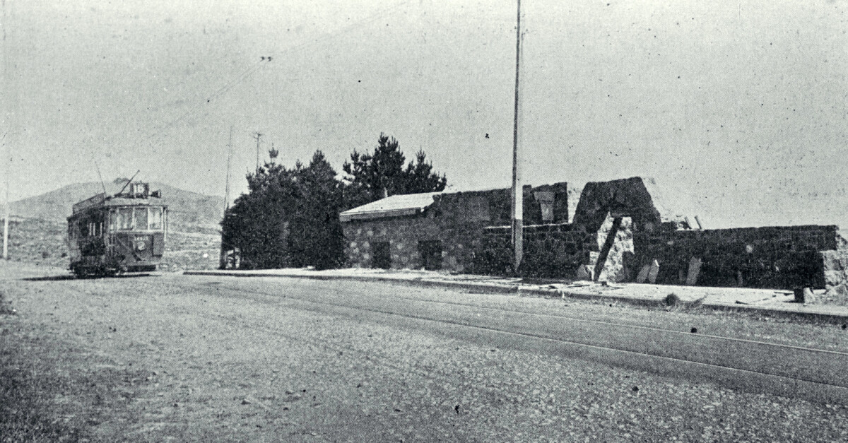 A tram arriving at the terminus rest-rooms Hackthorne Road