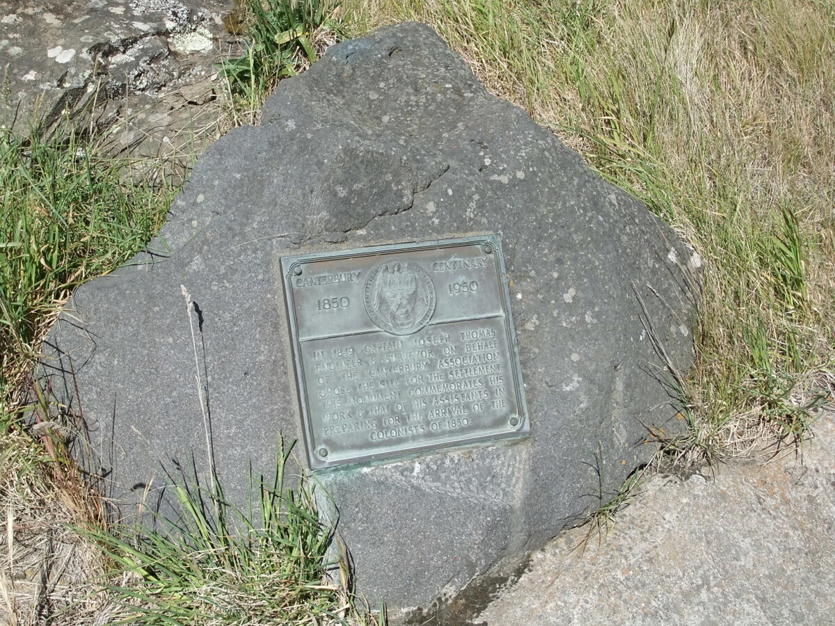 Plaque at the top of Evans Pass commemorating Captain Joseph Thomas, engineer and surveyor for the Canterbury Association. Canterbury Centenary 1850 - 1950.