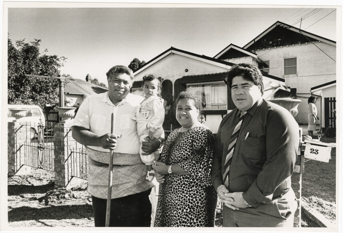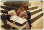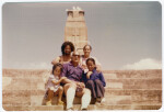 Members of the Ai'ono family seated on the steps at the New Brighton War Memorial along Marine Parade. Nina Ai'ono is in the pram, with Fa'asala (left) and Saunoa seated.