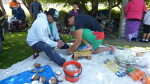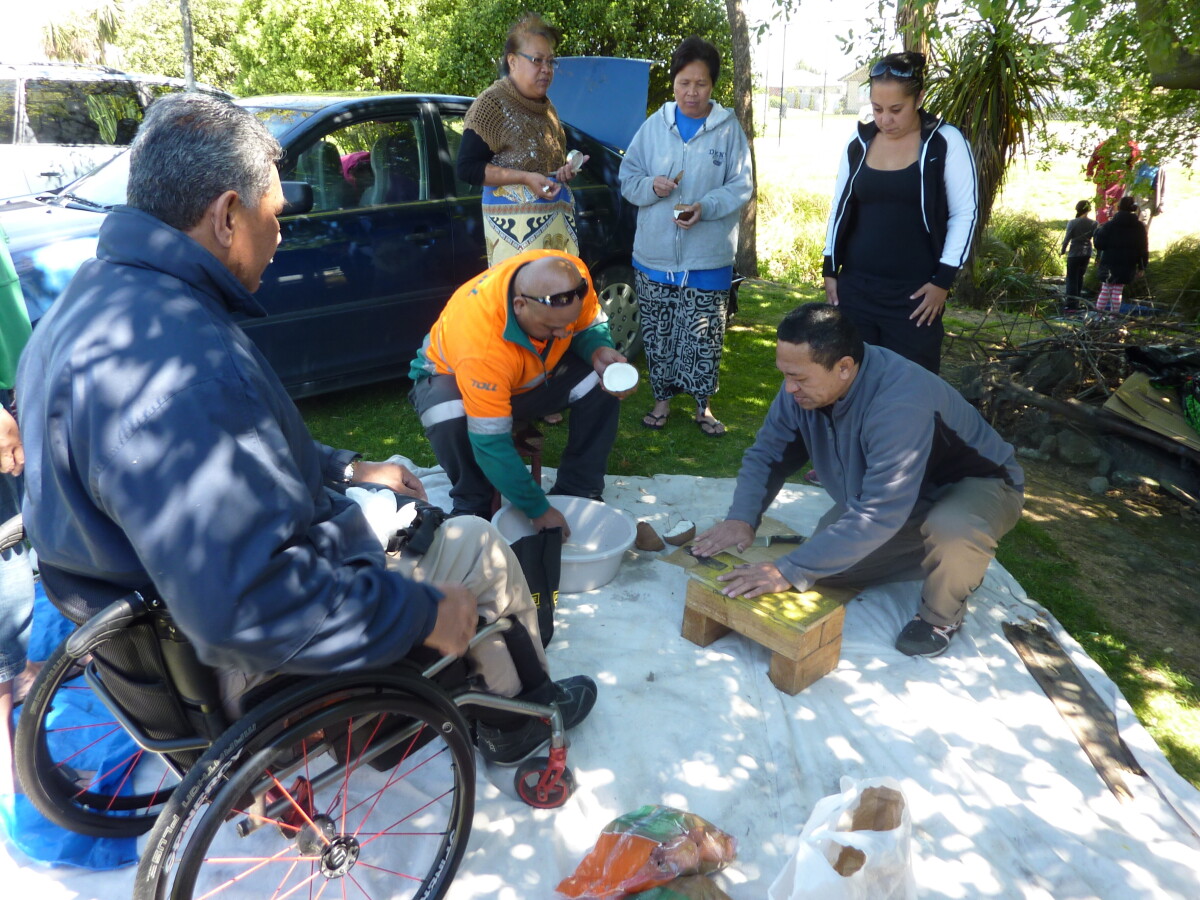 Poe delivering coconut scraping workshops at the Family day for Aiga Mulitalo. This was held at the Ekalesia Faapotopotoga Kerisiano Samoa (EFKS church) to prepare and cook an Umu.