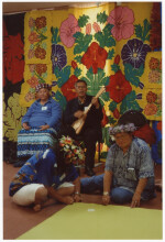 Rev T Tekeu with a ukulele, singing for the participants of a four Day Tivaevae workshop facilitated by the Enuamanu Vainetini from Tokoroa. Hosted by Stephanie and Rangi Oberg for the Christchurch branch of the National Council of Cook Island Women at the Ministry of Pacific Island Affairs, Armagh St, Christchurch.