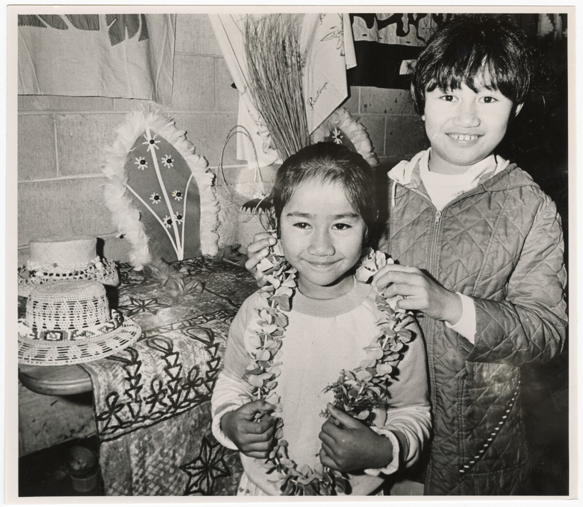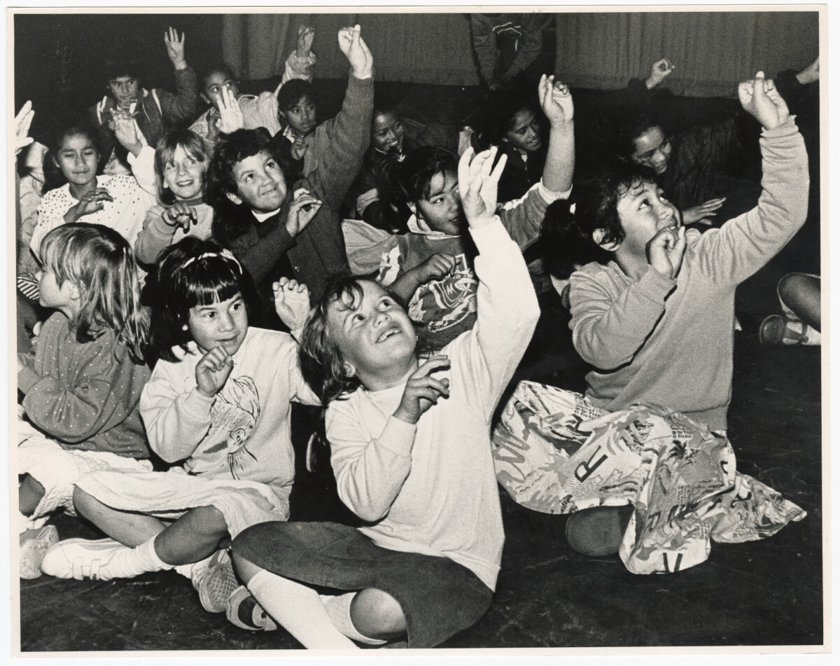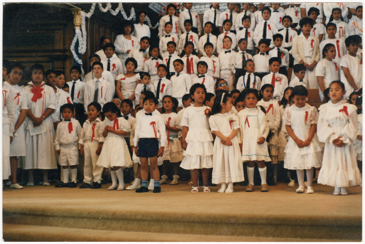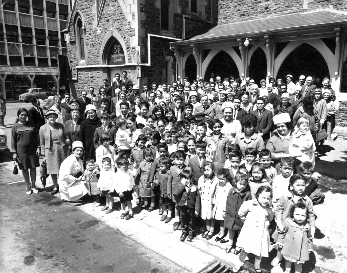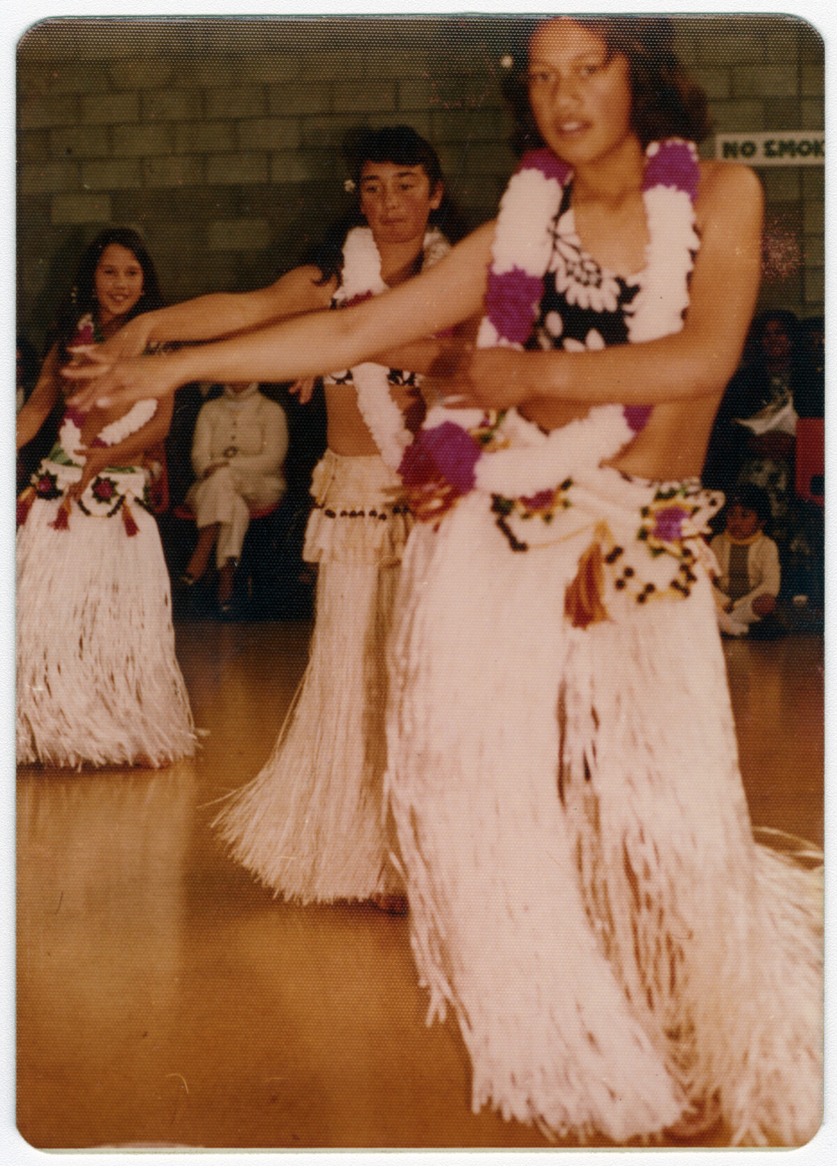 Rangi Oberg and her sister Puretu started a Cook Island Dance group in Christchurch comprised of their daughters and extended family. Most of the dancers were New Zealand born and taught to dance from a young age. The group ran from 1976 until 1982 and performed at formal and social occasions. The young dancers from left to right are Michelle Oberg, Tanya McGregor and Deborah Maoate dancing at St Pauls Church Hall in Cashel Street.