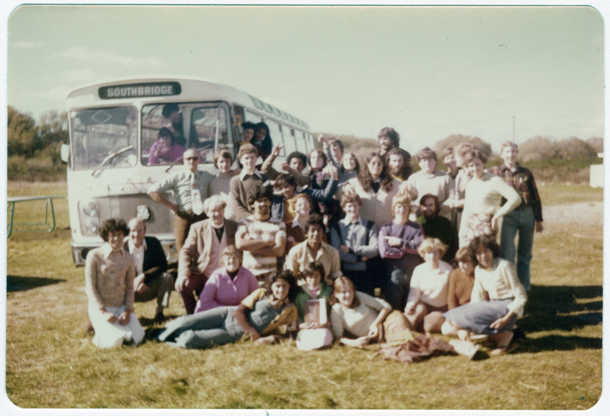 St Paul's PIC Youth Group Camp in front of Southbridge bus, somehwhere rural.