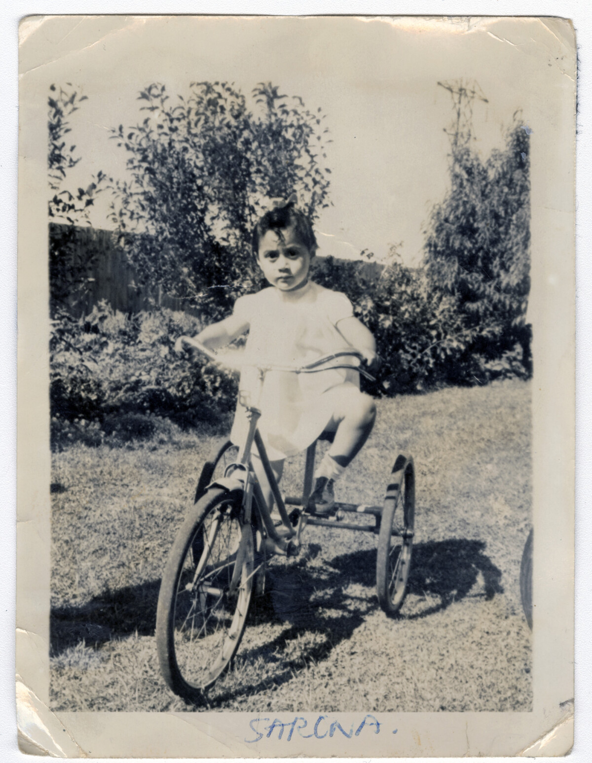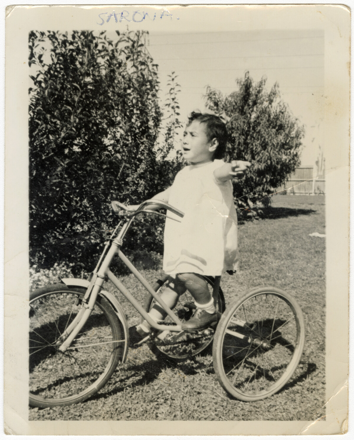 View of a child, Sarona Ai'ono, on a tricycle in a garden in Burnside.